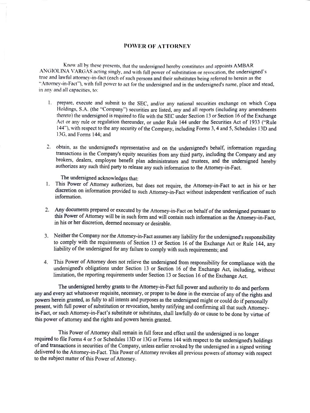 PO\VEI~ OF ATTORNEY Knm,· nil by these presents. thnt the undersigned hereby constitutes and appoints AMBAR ANGlOLlNA VARGAS acting singly, and with f'ull power of substitution or revocation, the undersigned's trnc and lawfhl attt,mcy-in-fact ( each of such persons and their substitutes being referred to herein as the "Attomcy-in-Fnct"), with fi.111 power to act for the undersigned and in the undersigned's name, place and stead, in :my ~nd :111 c:tp:tcitics. to: 1. prepare. execute and submit to the SEC, and/or any national securities exchange on which Copa Holdings. S.A. (the "Company") securities are listed, any and all reports (including any amendments thereto) the undersigned is required to file with the SEC under Section 13 or Section 16 of the Exchange Act or any rule or regulation thereunder, or under Rule 144 under the Securities Act of 1933 ("Rule 144"), with respect to the any security of the Company, including Forms 3, 4 and 5, Schedules 130 and 13G, and Fonns 144; and 2. obtain, as the undersigned's representative and on the undersigned's behalf, information regarding transactions in the Company's equity securities from any third party, including the Company and any brokers, dealers, employee benefit plan administrators and trustees, and the undersigned hereby authorizes any such third party to release any such information to the Attorney-in-Fact. The undersigned acknowledges that: 1. This Power of Attorney authorizes, but does not require, the Attorney-in-Fact to act in his or her discretion on information provided to such Attorney-in-Fact without independent verification of such information. 2. Any documents prepared or executed by the Attorney-in-Fact on behalf of the undersigned pursuant to this Power of Attorney will be in such form and will contain such information as the Attorney-in-Fact, in his or her discretion, deemed necessary or desirable. 3. Neither the Company nor the Attorney-in-Fact assumes any liability for the undersigned's responsibility to comply with the requirements of Section l 3 or Section 16 of the Exchange Act or Rule 144, any liability of the undersigned for any failure to comply with such requirements; and 4. This Power of Attorney does not relieve the undersigned from responsibility for compliance with the undersigned's obligations under Section 13 or Section 16 of the Exchange Act, including, without limitation, the reporting requirements under Section 13 or Section 16 of the Exchange Act. The undersigned hereby grants to the Attorney-in-Fact full power and authority to do and perform any and every act whatsoever requisite, necessary, or proper to be done in the exercise of any of the rights and powers herein granted, as fully to all intents and purposes as the undersigned might or could do if personally present, with full power of substitution or revocation, hereby ratifying and confirming all that such Attorney in-Fact, or such Attorney-in-Fact's substitute or substitutes, shall lawfully do or cause to be done by virtue of this power of attorney and the rights and powers herein granted. This Power of Attorney shall remain in full force and effect until the undersigned is no longer required to file Forms 4 or 5 or Schedules 13D or 13G or Forms 144 with respect to the undersigned's holdings of and transactions in securities of the Company, unless earlier revoked by the undersigned in a signed writing delivered to the Attorney-in-Fact. This Power of Attorney revokes all previous powers of attorney with respect to the subject matter of this Power of Attorney.
